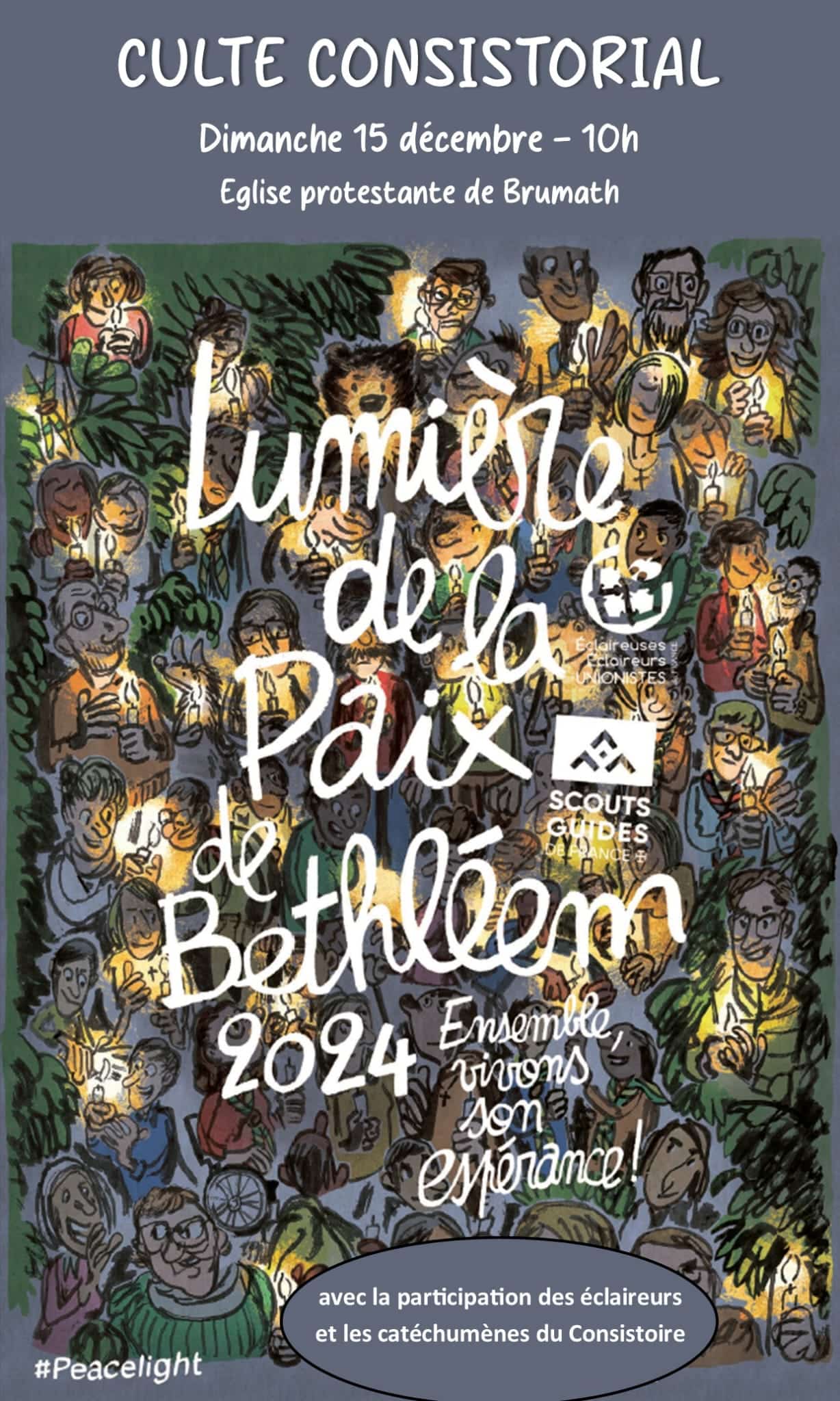 Cette année, la cérémonie aura lieu à l’église protestante de Brumath le dimanche 15 décembre à 10H00 et sera animée par les scouts de la paroisse protestante de Brumath et les catéchumènes du Consistoire. Bienvenue à tous !